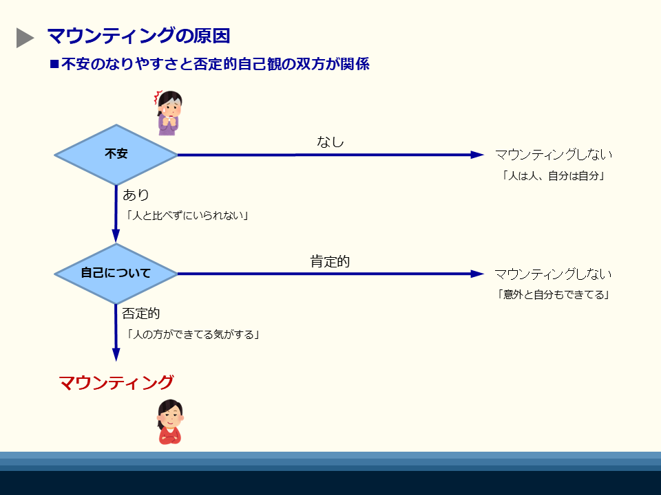 マウンティングしなくなるには、不安を低減すること自分への否定的な見方を改めることの2つが有効です。
