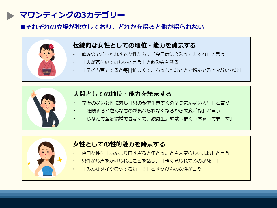 女性のマウンティングについては、3つの異なる立場に立ち、それぞれの優位性から他へのマウンティングが行われます※1