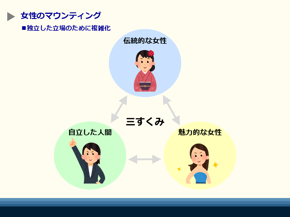 その立場とは、①伝統的な女性としての立場、②自立した人間としての立場、③性的魅力を備えた女性としての立場の3つです。