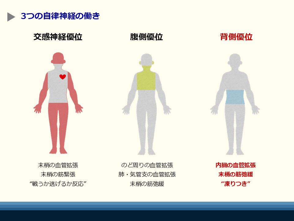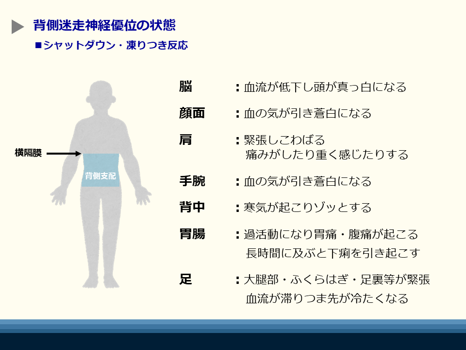 背側迷走神経優位とは心身の防御状態であり、心拍は弱まり、感覚は鈍り、感情は湧き上がりにくくなり、全身は硬直するため、凍りつき状態(シャットダウン)とも呼ばれます。