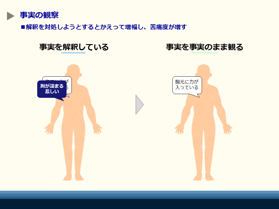 人前で話すときなども「手汗をかいている」と観察だけしておけばよく、「緊張している」と解釈すると余計に反応が昂ってしまうのと同じ仕組みです。